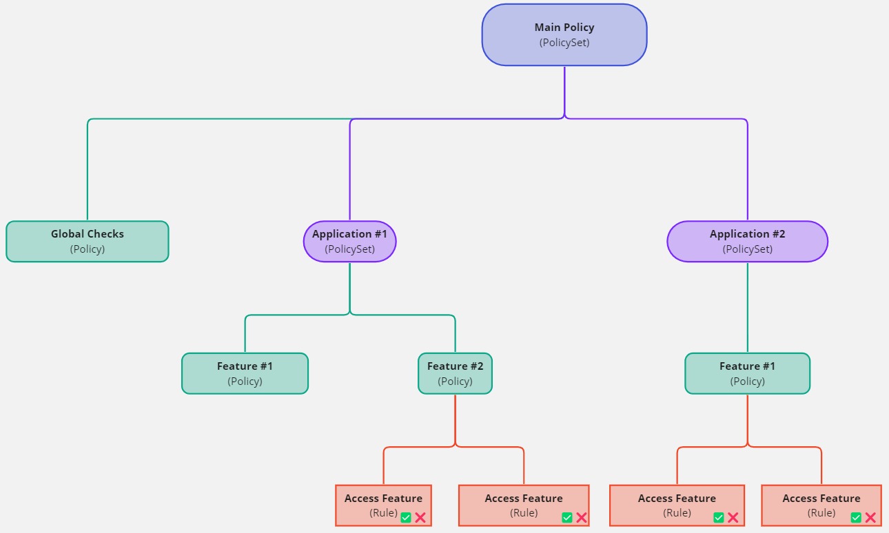 PolicySet: the PolicySet (PS) is generally the root element. It can contain other PolicySet elements as well as Policy elements. It can be referenced or inlined.Policy: the Policy generally lives inside a PolicySet element. It can be referenced or inlined. A Policy contains Rule elements.Rule: the Rule is the lowest type of structure. It contains the effect (Permit or Deny).